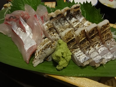 つづいてもお刺身の登場です!太刀魚とアジのお刺身です〜!まず美しいの一言!とってもきれいなお刺身ですね。アジをいただくと、、、うん!おいしい〜!つづいてタチウオ!食感がたまりません!いや〜鮮度が抜群ですね!