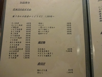 カウンターだけのお店です。お店にはいって日本酒をいただきながら、メニューをみていろいろお願いしてみました。まずはお刺身を。