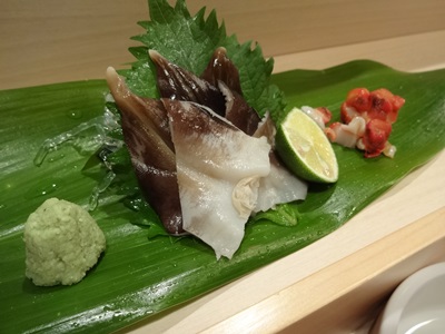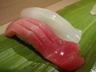 いきなりトロ!そしてイカ!このトロ、大きいですね〜!一口いただくと、、、口の中でとろけていきます〜!ひさびさにおいしいトロをいただきました!イカもほどよい歯ごたえがたまりませんね!
