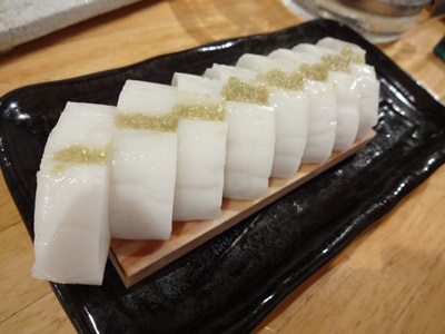 ここで、ちょいとおつまみに。板わさをお願いしました。ボリュームたっぷりだしてくださるのでありがたいですね〜。