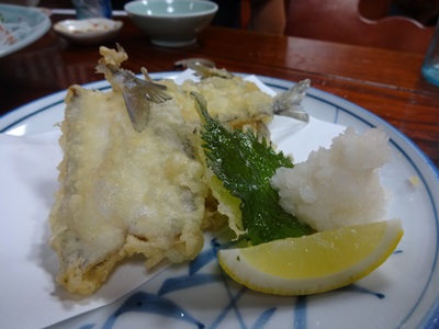 はまぐりに続いていただいたのが、なんとサヨリのてんぷら!サヨリっててんぷらできるんですね!こちらもサクサクでおいしい〜〜〜!天つゆも抜群!