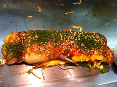 待っている間は焼酎を飲みながら、鉄板の上の華麗なヘラ捌きを拝見させていただきました!かなり混んでいましたので、ちょっと待ちましたが登場したお好み焼きをみておいしそう〜!お好み焼きのいい香りがしています!
