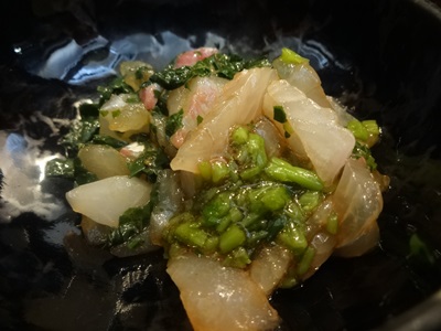 まず登場したのが白身とモロヘイヤを合わせたもの!ポン酢風味でいただきます。う、うまい〜!作りおきではなく、目の前で大将が作ってくださいます。いきなり日本酒が欲しくなりますね〜!ということで最初にいただいたのが、大倉というお酒でした!