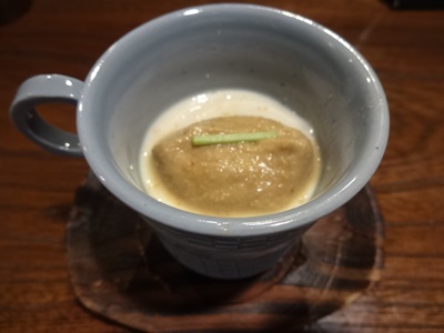 まずは先付けは自家製豆腐の焼きナス醤油かけをいただきました!豆腐もしっかりしておいしいですし、焼きナスの香りがとってもすばらしいです〜!
