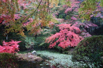 くっきり紅葉したもみじが!池には緑の葉があたり一面にしきつめられているようでした。美しい庭園に感動!