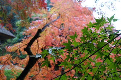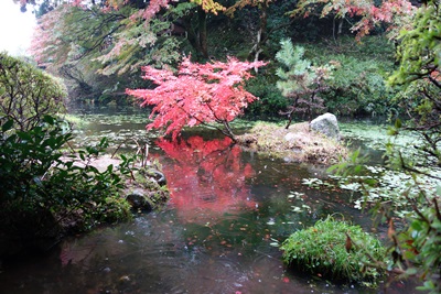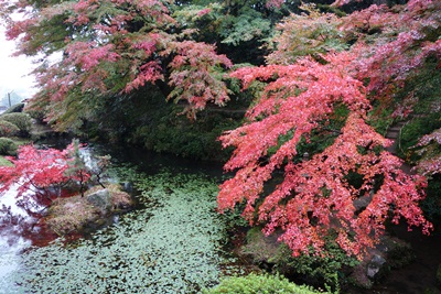 池のほうに歩みをすすめてみると、紅葉したもみじとまだ紅葉していないもみじが並んでいました。これから紅葉がさらにすすむと、さらに深紅が美しいことと思います。