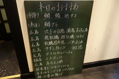 さあ、今日のおすすめの料理は何があるかな〜と思っているマネジャーさんがすっと席の隣にセットしてくださいました。ふむふむ、、、ほとんどが広島産というところがうれしいですね〜!地元愛が感じられます。