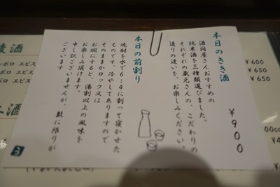まずは日本酒をお願いしました。今年まだ飲んでいないような、、、広島は黒瀬の賀茂金秀さんです。つまみをいろいろとお願いしてみました。賀茂金秀さんの独特の香りと風味がたまりませんね。