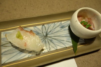 ここで茶碗蒸しが登場しました!いいダシがきいていますね!つづいて握りが登場しました。こちらもとってもおいしい〜〜!石鯛をなにかと和えてありましたが、もう最高でした!