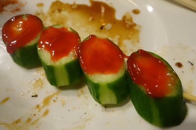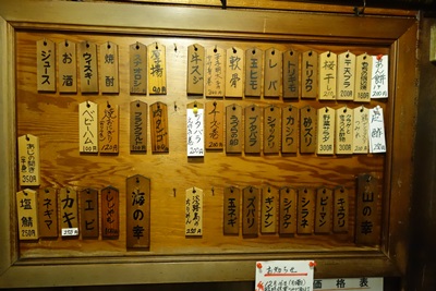 メニューは壁のボードに木札で表示されています。料金は串の根元の色で判断されます。でも高くても200円ですからね〜。ボリュームも満点で最高です!
