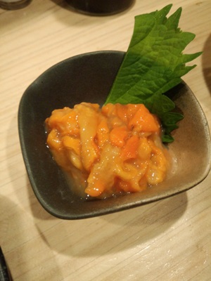 つづいて赤なまこをポン酢でいただきました。歯ごたえもよくって日本酒によくあいますね〜!伯楽星という日本酒と磐城 寿という日本酒をいただきました。伯楽星が特においしかったですよ〜!