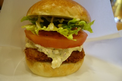 あの看板のハンバーガーが食べたいと思ったので、メニューに書いてあったハンバーガーにトマトとベーコンをプラスしたものをお願いしました。友人はフィッシュバーガーにトマトをトッピング!