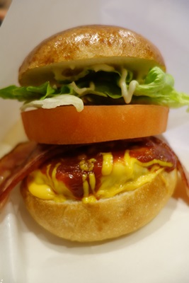 まずはノンアルコールビールで乾杯!待っているとどどーんとハンバーガーが登場しました!お、お、おいしそう!先ほど食べたお昼ご飯のことをすっかり忘れて、大きな口をあけてがっついてみました。パンがまずおいしい〜!そしてパティも肉厚でジューシー!とあるバーガーチェーンのものとは全く違いました!ベーコンも最高です!トマトも程よい厚さ!