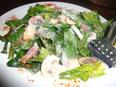 まずは生ビールで乾杯しまして、マッシュルームとほうれん草のサラダをいただきました。このサラダ最近は定番となりつつありますが、ほんとおいしんですよね〜。粉チーズがいいアクセントになっていて、マッシュルームが特においしいです!