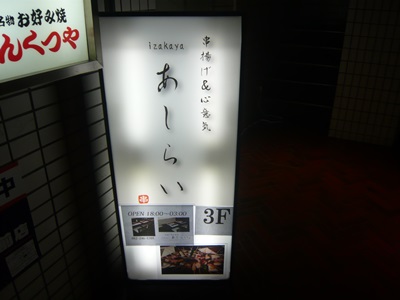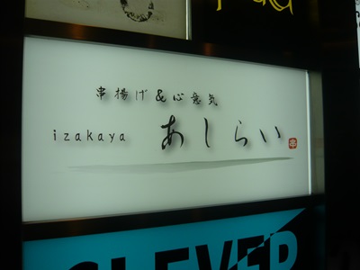 するとぶると味さんから徒歩で1分もかからないすぐ近くのビルの3Fにありました。お店の名前はあしらいさん。ん?看板をよくみると、、、串揚げ&、、、、え?心意気?串揚げ&心意気のお店と書いてありました。