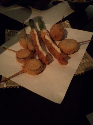 れんこんおいしいですね〜!そのほかささみ梅しそもおいしかったです。なすやしゅーまいなんかもいただきました!広島で有名な串揚げ屋さんで修行されたんだそうです。