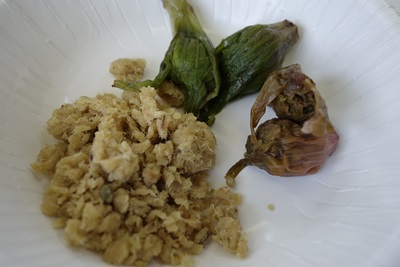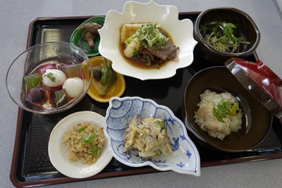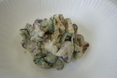 この日の献立はごらんの通りです。まずは基本の胡麻和えから。胡麻和えっていつもほうれん草の胡麻和えしかたべていないのですが、この日は具材が豪華ですね。先生の説明をききながら、胡麻和えのペーストを一口たべさせていただきました、、、、うまい、、、胡麻和えって本当はこんな味なんですか、、、と気付かされるほどのおいしさ!甘さの中になんていうんでしょうか、、なにか隠れている感じです。この胡麻和え用のペーストってどうやってつくっているんだろう、、、胡麻和えもおいしくいただきました!さすがですね〜!