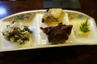ここで先付けが登場しました!白和え、飯だこ、あさり、玉子豆腐だったでしょうか?どれもほんとにおいしいです!心の中ではおかわりしたいくらいでした。