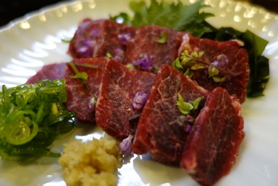 ここで本日のメニューをみながら、、、くじらのお刺身をお願いしました。くじらのお肉は小学校のころ、給食でよく竜田揚げとしていただいていました。くじらおいしい〜〜!