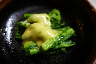 つまみとして、まかないというメニューをお願いしました。この日は菜の花でした!これがおいしい!おでんもあったので、おでんもいただきました!こちらも美味!