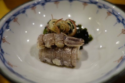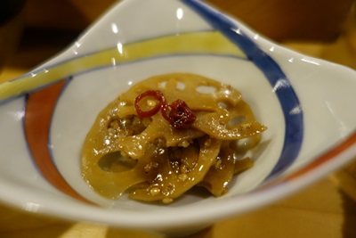 さて、この日もおまかせでお願いしました。まずはシャコからいただきます。シャコ、おいしいですよね〜。この時期だと子持ちのシャコもいるんだそうですよ〜。レンコンもいただきました。