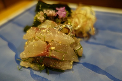 ここでアジが登場しました!胡麻であえてありますね。いただいてみると、、、うわ〜!驚きのおいしさ!あっという間に食べちゃいました〜!