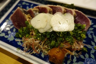 もちろんいただきます!ということで登場したのがカツオのたたき!にんにくスライスもしっかりのせてくださいました〜!一口いただいてみると、、、、ほんとにおいしいです〜!すばらしいおいしさでした〜!いや〜またもや最高です〜!カツオって5月くらいからって感じがしていたのですが、この時期にもあるんですね〜!