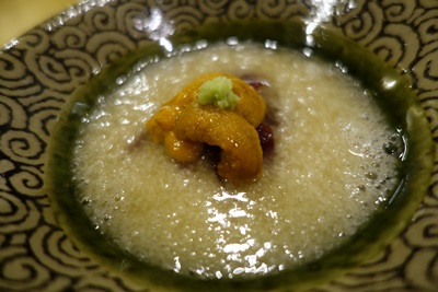 つづいて登場したのが、山芋とマグロとウニでした!マグロのやまかけにウニがのっているという形ですね。ウニは北方四島付近で取れたウニなんだそうですよ〜!たまらなくおいしくって、大将もびっくりされるほどスピード感たっぷりでいただきました!