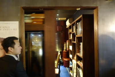 お店に入ってスタッフの方が案内してくださいました。こちらです、、、、え?これ、、、書棚ですけど、、、えーーーーーー!なんと書棚がずずーっとスライドして、そこには個室が広がっていました!すごーーーい!先日笹木トンネルさんにうかがったとき以来の驚きでした!