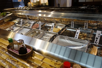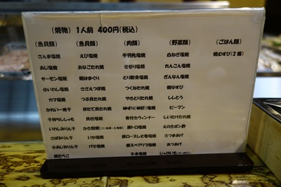 まずは生ビールをお願いして、メニューをみてみると、、、いろいろ種類が豊富!目の前には食材がずらりと並んでいました。ちょっと遅くに伺ったのでもうないものもあるようです。