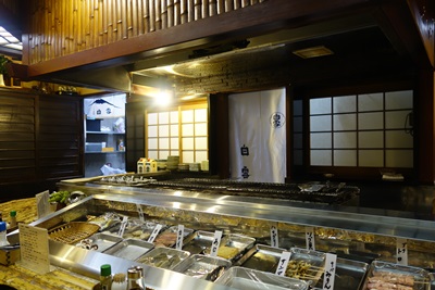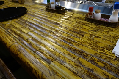 がらっと扉があくとそこには半円状のカウンターがありまして、これぞ炉端焼きという雰囲気が伝わってきました。いい雰囲気です。カウンターは珍しく竹で仕上げてありました。これは勉強になりますね〜!肌触りも心地よいです。