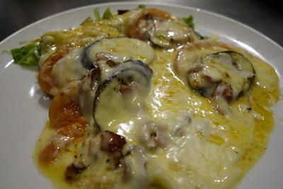 ここで、ナスチーズを!なすを高温の鉄板で焼き上げて、そこにとろっとろのチーズがたっぷりかかっています。見ただけでおいしそうですよね〜!最高ですね!間違いないおいしさです!