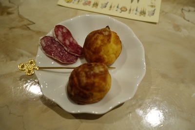 アミューズとして、塩サラミと、、、えっと、、、えっと、ぐる、、グリュ、、、3回も教えていただいたのですが、忘れちゃいました。香りはとっても甘いのに、いただくと甘くなくってチーズの風味が広がります。おいしい〜〜!