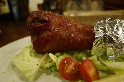 USJのジュラシックパーク?なんのことかわかる前に食いしん坊の私のことですから、ガブリと一口噛みついておりました。う、うまい!普通のトリの足とはなんだかちがって、上質なハムのような触感と風味がします。これはおいしいですね〜!