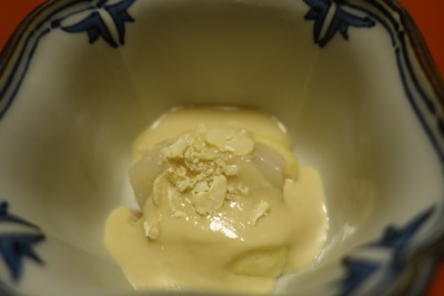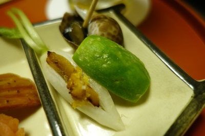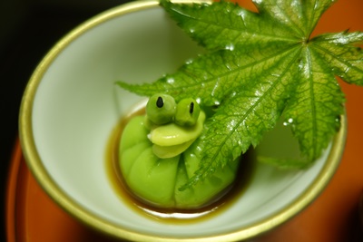 まずは生ビールで乾杯をして、先付けが登場しました。タイラギ貝といちじくの和え物ともうひとつは、、、かえる!かえるじゃなくて、かえるのようにあしらわれていました。おそらくお豆からつくられていると思います。かわいいですね〜、季節感を感じます。もちろんおいしかったです!