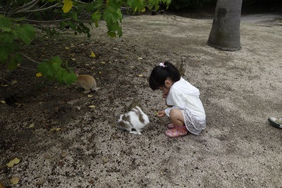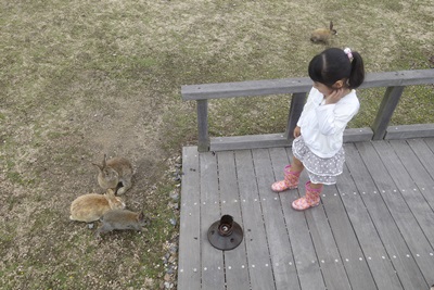 さて、さきほどのうさぎの楽園、大久野島の続きです。竹原の忠海港から12分くらいで到着した大久野島の桟橋をぬけると、そこからうさぎさんが大歓迎で出迎えてくれました。娘も大興奮!