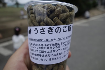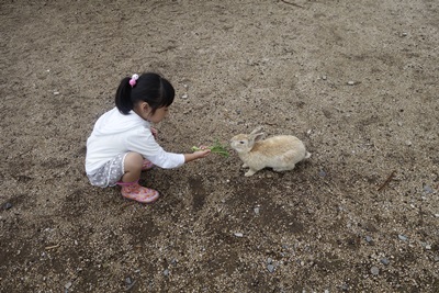 ものすごい勢いでうさぎが集まってきます。娘は恐れることなく手にえさをおいて、うさぎにあげていました。途中、うさぎにちょっとあまがみされてもあまりびびることなく。