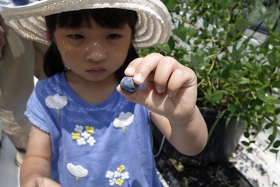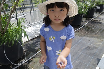 係りの方が説明してくださったのですが、ちょっともうオニールは終わりに近づいているようでして少ないかもとおっしゃっておられました。その通りすくなかったですが、でも十分味わえるくらいはのこっていました。娘も自分で熟したブルーベリーを摘んで満足そうでした。