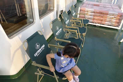さて、昨日ご紹介いたしました江田島汽船さんの夕焼けクルーズの続きです。ついに乗船して船員さんからお声がかかり夕焼けクルーズの方が入ることができるデッキへと案内していただきました!船員さんの背中を見ながら階段をのぼると、、、そこにはチェアが用意してありました!