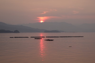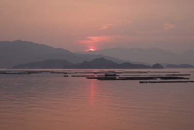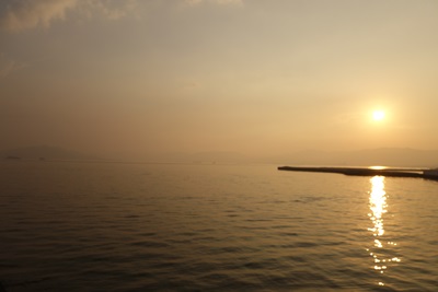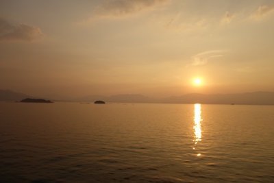 一般船室とは違い、一段あがっただけなのにこんなにも景色が違うとは思いませんでした!すばらしい景色でした!太陽も日の入り間近でちょうどいいですね。まずは一枚パシャリ。夕日が美しいです。