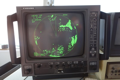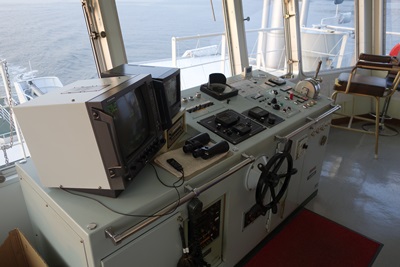 しばらくすると、機関長がお越しになられてキャビンを見せてくださいました〜!船長が運転されているところですね。初めて入りました。舵も実際にまわすことができました。機器についても詳しく教えてくださいました〜!レーダーもわざわざ操作してくださって、小さないかだまでちゃんとうつっていましたよ。