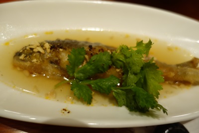 つづいて登場したのが、、、なんと天然鮎!コリアンダーが添えてありました!パクチーですね!これがまた抜群においしいのなんのって!天然の鮎ですからしっかり残してくださっていた内臓の部分をいただくと、、、ちょっぴりコケの香りがほわ〜んと漂います。おいしいですね〜!コリアンダーと一緒にいただくとこれまた最高においしいです!まさか天然鮎をいただけるとは思っても見ませんでした!