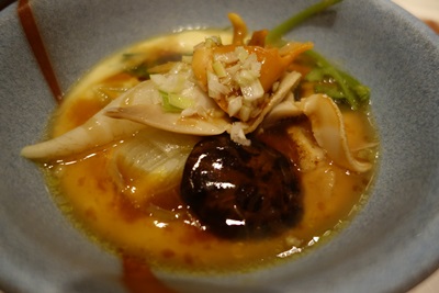 次に登場したのが、たっぷり野菜が入った茶碗蒸し風のお料理でした。こちらも福山で取れた中国野菜がたっぷりはいっていました。小さな大根やしいたけ、ペコロスと貝が入っていました。せがわさんでは普通の中華料理は基本的にはでてきません。その日の食材を見られてご主人が考えられてお料理してくださいます。ものすごい想像力の持ち主ですね。9月に香港にまた勉強に行かれるそうです!