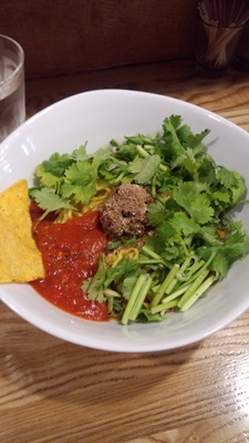 おいしそう〜!いい香りがします!しっかり混ぜていただいてみると、、、うまい〜!これはうまい!チリトマトとパクチーがこれまたあいます!