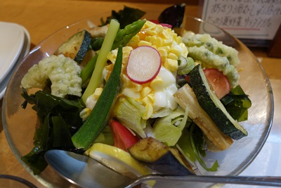 つづいて夏野菜のサラダをお願いしました!もうボリューム満点でさらに揚げたての夏野菜もついてきて感動!おすすめしたい一品です!
