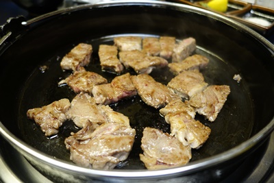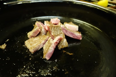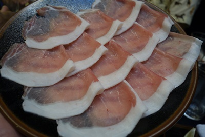 ステーキをたらふくいただいた後は、今度は鍋になります。さきほどいただいたステーキの脂身の部分は切り落としてこの鍋に入れてしまいます。上質な脂が鍋にこくを加えてくれるんですね!鍋には豚肉を入れていただきます!