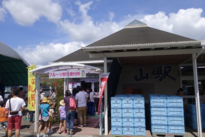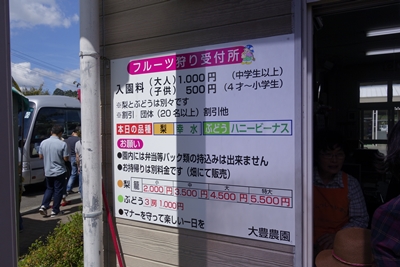 さすがの3連休でさらには食欲の秋でそして梨が旬ですからものすごいたくさんの方が訪れていらっしゃいました。すごい盛り上がりです!フルーツ狩のコーナーに行って見ると、梨狩りのほかにぶどう狩もやっていました。チケット購入に並んでいる間は梨狩りの気分だったのですが、、直前になってぶどう狩もいいねということになりまして、、、、、結果、、ブドウ狩をすることに!今回の品種がハニービーナスという知らない名前だったので食べてみたいのもありまして。