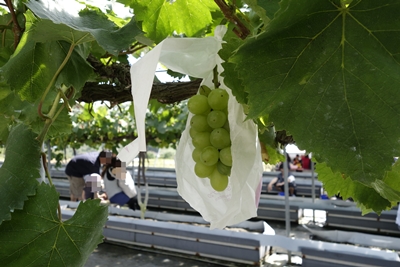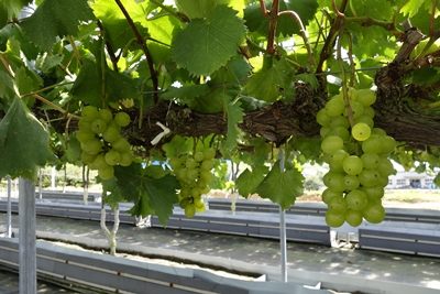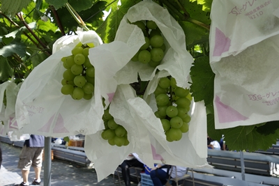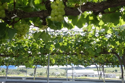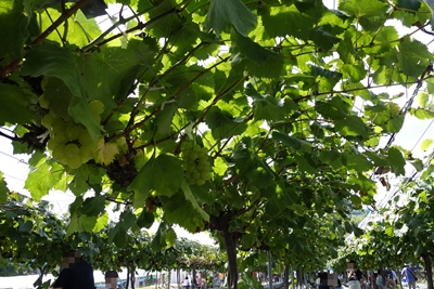 ぶどう園に到着すると係りの方がいろいろ説明してくださって、ぶどう狩がスタートします!ぶどう園にはほんとにたくさんのブドウがなっていました!すごい!緑色なのでマスカット系なんでしょうか?なんだかものすごくおいしそう!