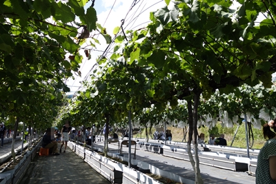 チケットを購入して、すぐ裏手のバス乗り場から大型バスでぶどう園まで送迎してくださいます。歩いてもそんなに時間がかからない場所なのにやさしい対応ですね!バスはほぼ満席になりました!お昼過ぎだったのですが、すごい人気です!