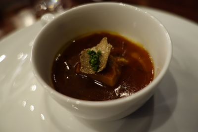 まずはシャンパンで乾杯しました!ボランジェでした。最初のお料理はフォアグラの茶碗蒸し風のサマートリュフ添えです。サマートリュフ、初めていただきました!そしてフォアグラがたまらなくおいしかったです。フレンチらしからぬ斬新がお味が印象的でした!なんだか和食にでてきそうな風味!すばらしいです。